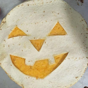 They are such a cinch to make: Get 2 tortillas. With a small fairly sharp knife, carve out a Halloween face on one of your tortillas (eat what you cut out - don't waste !).